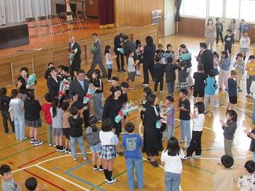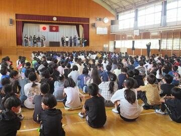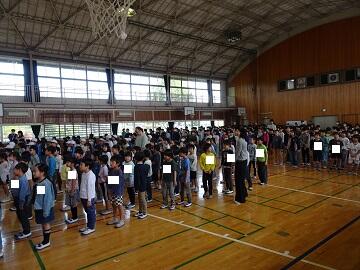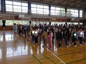 2年生から6年生までの児童に迎えられ,しっかりとした足取りで入場しました。整列後は,6年生代表児童のお迎えの言葉にしっかりと耳を傾けていました。式の最後は,本校のオリジナルソング「イシンデンシン」を上級生全員で歌って聞かせました。明るく元気な歌声が体育館に響きました。