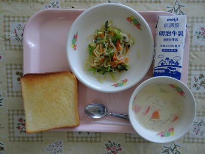 「シュガートースト」はひさしぶりの登場です。週に1回パンの日は楽しみですよね。今日は少しはちみつも使いました。新田小のシチューはルウを小麦粉やバターで手作りしています。調理員さんの愛情のこもった優しいシチューです。