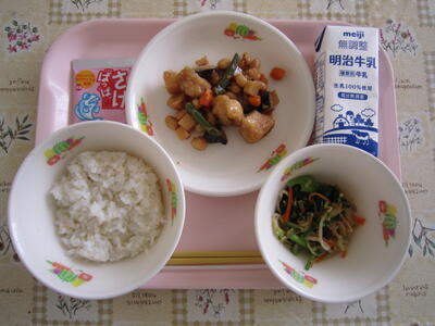 むぎいりごはん ぎゅうにゅう さけぱっぱふりかけ とりにくとだいずのみそいため おひたし