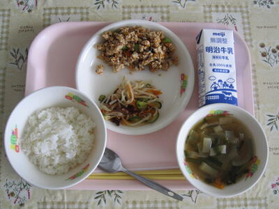むぎいりごはん ぎゅうにゅう セルフとりぞぼろ やさいのちゅうかあえ みそしる