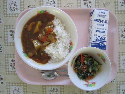 麦入りごはん 牛乳 チキンカレー ほうれん草とキャベツのサラダ 手作り中華ドレッシング
