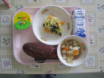 ココア揚げパン 牛乳 野菜とウインナーのスープ煮 ゆで野菜 和風ドレッシング はちみつレモンゼリー