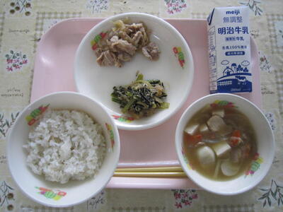 麦入りごはん 牛乳 豚肉のしょうが焼き 小松菜とじゃこの炒め物 さつま汁