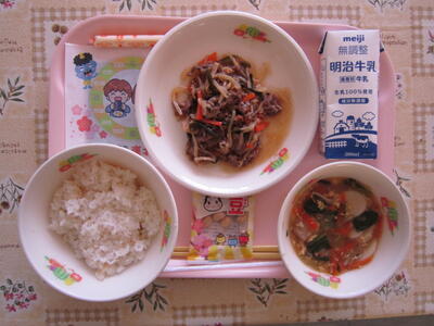 むぎいりごはん 牛乳 プルコギ トックスープ 手巻きのり チーズ 福豆