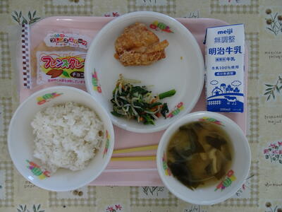 6年生のみなさんに食べたい料理をアンケートしました。今日は6年1組でリクエストの多かった「からあげ」「からしあえ」「クレープ」を取り入れた献立です。