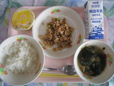 むぎいりごはん ぎゅうにゅう セルフとりそぼろどんのぐ ちんげんさいととうふのかきたまスープ レモンゼリー