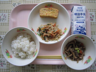 麦入りごはん 牛乳 まいたけご飯の具 卵焼き もやしとにらのごまあえ