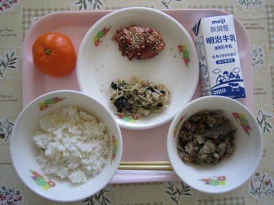 むぎいりごはん 牛乳 鶏肉の三味焼き 大根のいそべあえ 干ぴょうの炒め煮 みかん