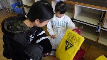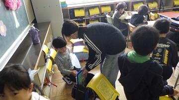 ランドセルから教科書類を出したり,荷物を片付けたりするなど1年生がスムーズに行えるようサポートをしています。