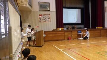 体育館に戻り、学校探検クイズをしながら、振り返りをしました。1年生は「学校の中がよく分かった!」と嬉しそうに話していました。2年生もその笑顔を見て、「1年生のペースに合わせるのは大変だったけど、1年生が楽しそうでよかった!」と嬉しそうでした。