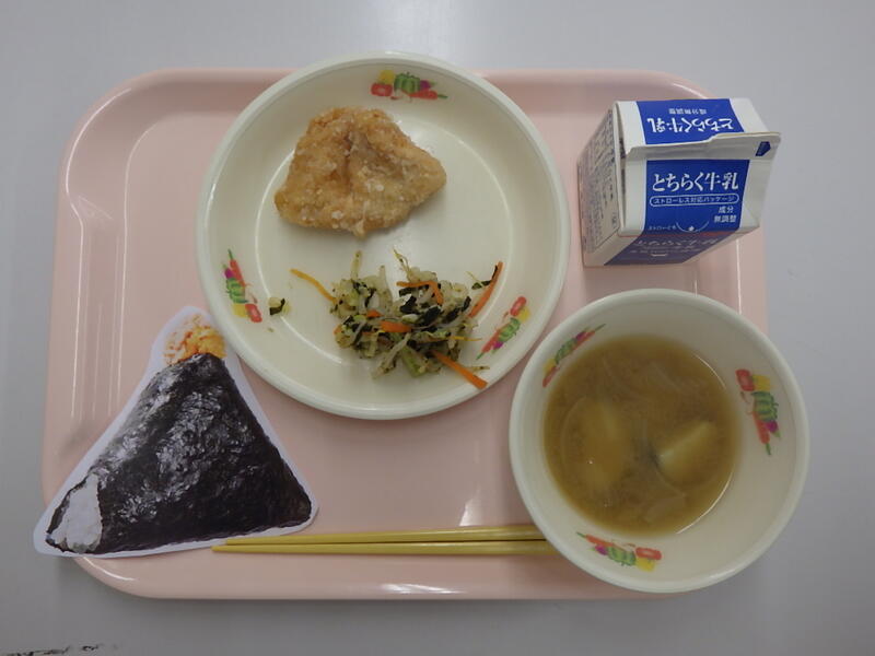 一覧へ 11月5日献立 日時 2025年11月05日(水) 公開対象 おいしい給食 詳細 おにぎり(自宅から持参) 牛乳 鶏肉のから揚げ いそべあえ みそ汁 今日はおにぎりの日です。 みんな自分で考えたおにぎりを持ってきました。 みそ汁には給食農園のさつまいもがたくさん入っています。 作成者 城山西小学校 更新日時 2025-11-16 15:08:01