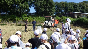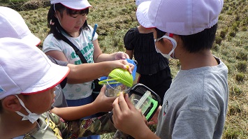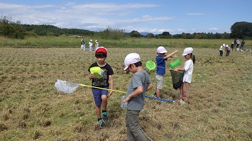 稲刈りを終えたばかりの田んぼには,カエルやイナゴ,トンボなどがいました。持参した網で捕まえ,上手に虫かごへ移していきます。