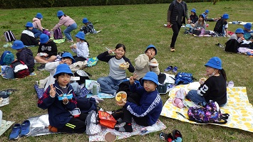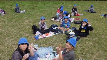 次に,益子の森に移動し,広場でお昼ご飯を食べました。青空のもと,レジャーシートの上で食べるお弁当は格別だったようです。