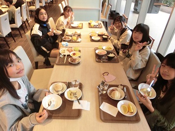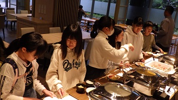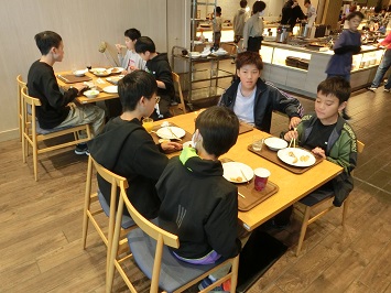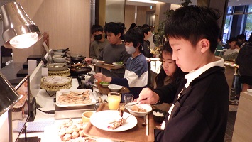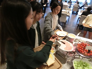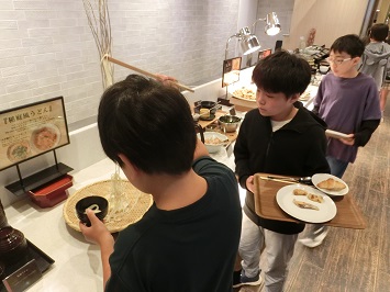 2日目の朝は6:00に起床し,2クラスずつ朝食をとりました。バイキング形式なので,順番に並び好きなメニューを取り,指定されたクラスの席で食べ始めました。