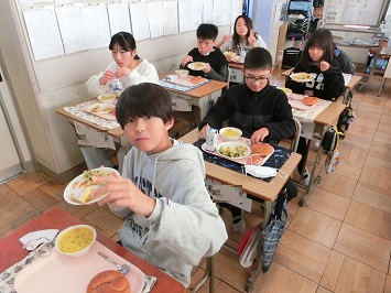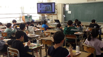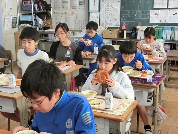 給食の時間には,全校放送で図書委員の児童がお話給食について説明しました。その後,各教室にて図書委員が朗読する「14ひきのかぼちゃ」を視聴しながらおいしく給食を食べました。