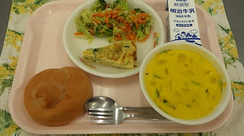 <献立>いちご米粉パン,牛乳,スペイン風オムレツ,ゆでやさい(和風),かぼちゃのスープ