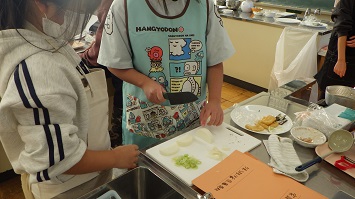 サラダは,野菜とハムを分けて提供しました。児童たちは「いただきます」の挨拶を済ませると,物語にあるとおり,くりんくりんとサラダを混ぜて食べていました。