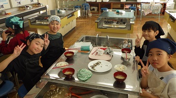 給食の時間には,全校放送で図書委員の児童がお話給食について説明しました。その後,各教室にて図書委員が朗読する「14ひきのかぼちゃ」を視聴しながらおいしく給食を食べました。