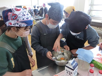 丁寧に卵を割ったり,米粉の重さを量ったり,家庭科の時間に学んだことを生かして活動していました。