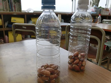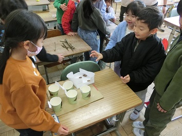 1年生のあるクラスをのぞいてみると,何やら楽しそうに活動していました。11月28日に生活科の校外学習で子ども総合科学館の「冒険広場」を訪れた1年生。たくさんの「秋」に触れるとともに,落ち葉や木の枝,どんぐりや松ぼっくりなどを拾ってきました。学校に帰ると,それらを使って作品づくりをしました。