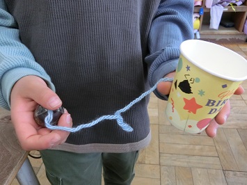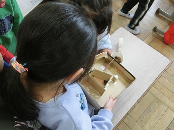 迷路やけん玉,コマ,マラカスなど様々な作品があり,クラスの子が作った作品で楽しそうに遊んでいました。