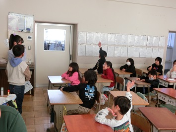次に,それぞれの教室に移動して,小学校がどんなところなのかクイズ形式で紹介しました。司会の児童を中心に,小学校のことを知ってもらおうと一生懸命伝えていました。