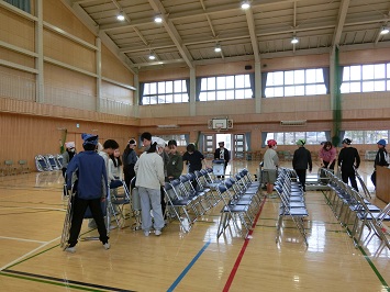 入学式前日のこの日,6年生の児童が入学式準備を行いました。体育館では1年生と保護者の方が座る椅子を並べたり,掲示物を貼り付けたりと会場づくりを行いました。