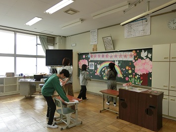 3月18日に行われた卒業式前日の様子です。5年生と教職員が協力して式典会場である体育館や教室等を整えました。担当教員の指示を聞きながらてきぱきと作業を進めていました。そのお陰で,厳粛かつ温かい雰囲気の会場と教室になりました。