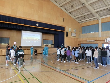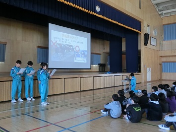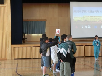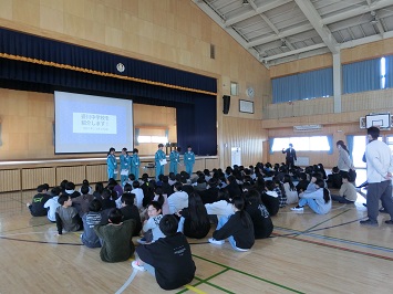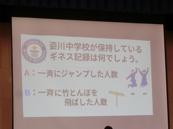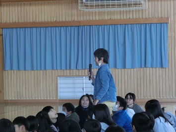学習,部活動,学校行事,服装など小学校とは異なる中学校の様子を,クイズ形式で教えてくれました。児童たちは,クイズを楽しみつつも,先輩たちの話を一生懸命聞いていました。