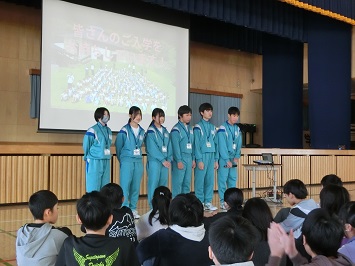 宮っこチャレンジ(職業体験学習)のため来校している姿川中の6名の生徒が,本校の6年生に向けて,中学校生活について紹介してくれました。