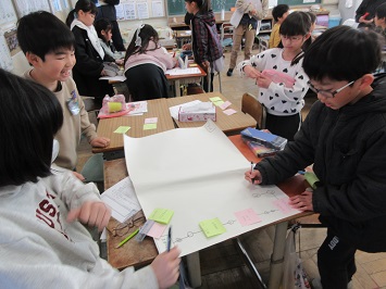 第2時では,学んだことを活用し,「健康すごろく」をグループで作成しました。健康のためによいとされる行動,そうではない行動を書いた付箋を使い,話し合いながら作っていました。