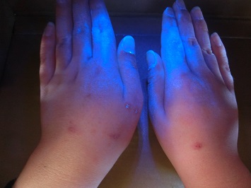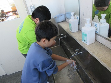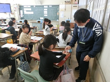 第3時の授業は業間後の3時間目に実施しました。校庭で元気に遊んだ児童たちは,手洗いなどを済ませ着席しました。しかし,水を含んだ脱脂綿で手のひらを拭いてみると,汚れが残っていました。体を清潔に保つことがどうして大切なのか学び,授業の最後には手洗いチェッカーを使って正しく手洗いができているかどうか確かめました。