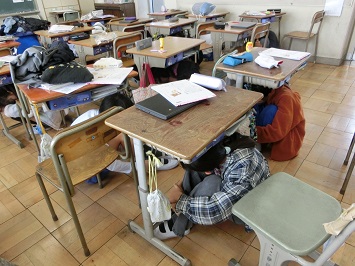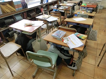 業間の時間,児童たちがいつも通り校庭や教室,図書室等で過ごす中,突然放送が流れました。地震を知らせる放送です。校内にいた児童は,すばやく近くの教室に入り,机の下で身をかがめました。