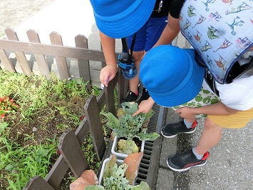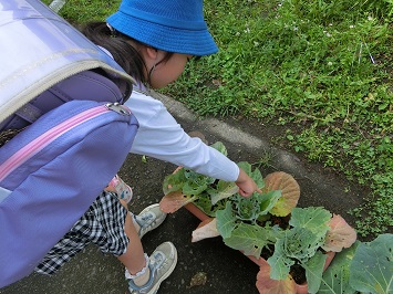 朝顔のお世話をしている1年生と共に,朝の時間や休み時間を使って,2年生の児童も野菜のお世話に取り組んでいます。以前2年生の児童が話をしてくれた,「虫が葉を食べてしまう」という悩みについてはまだ未解決なようで,虫を見つけたら鉢から別の場所に移しているそうです。