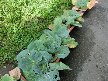 花壇の近くと中庭に置いてあるキャベツの葉に,モンシロチョウの幼虫がいました。3年生の理科の授業で観察しているそうです。成虫が4月に黄色い小さな卵を産み,卵からかえった幼虫がキャベツの葉をたくさん食べて大きくなっているのだと3年生のある児童が教えてくれました。確かに,キャベツの葉にたくさんの穴が開いていました。