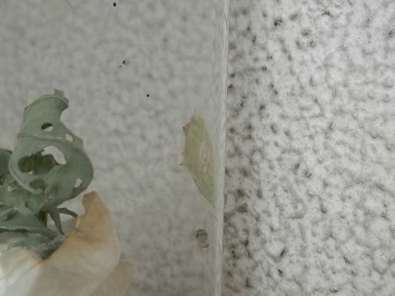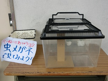 また,3年生の教室前の廊下には,3年の学級担任がさなぎの入った虫かごを設置し,児童が自由に観察できるようにしています。今後も,卵から幼虫,さなぎ,成虫へと成長していく様子を観察していく予定です。
