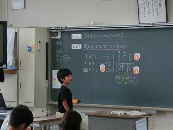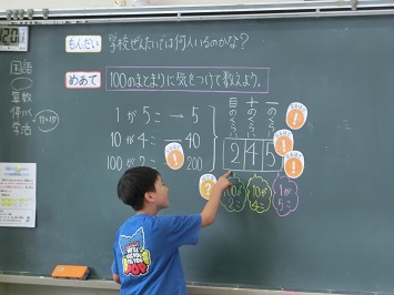 2年生では,算数の時間に「100より大きい数」について学習しています。この日は,10や100のまとまりごとに数を数えました。授業の最後には,「なるほど」と「はてな」の掲示物を用いて,今日の学習で納得したことや疑問に思ったことを発表しました。