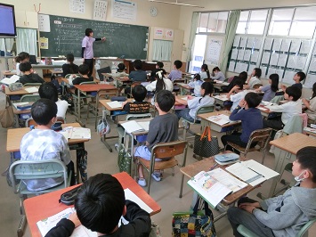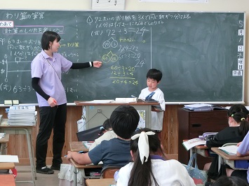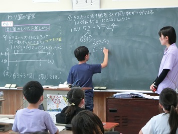 4年生は,算数の時間に「わり算の筆算」を学習しています。この日は,文章問題から式を立て,計算方法を考えました。