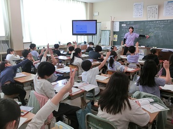 これまでに学んだ「さくらんぼ算」や図を使い,ノートに考えを書いていました。多くの児童が手を挙げて自分の考えを発表しようとする姿勢が見られ,感心しました。