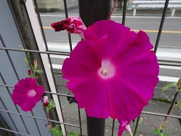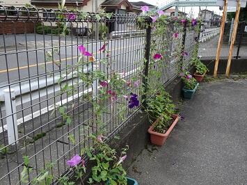 正門隣のフェンスに咲いているアサガオは今が満開時のようです。元気よく咲く色とりどりの花が児童の姿と重なるように感じます。