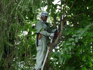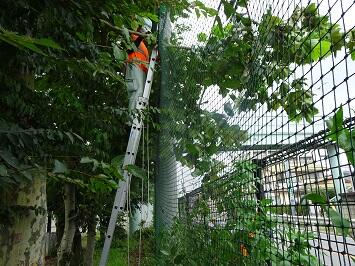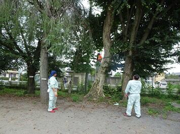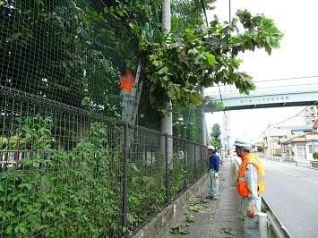校地東側の防球ネットからはみ出している枝を切り落としてもらいました。これで少しは通行の妨げは除去できたと思います。学校としましては定期的に環境点検を行っておりますが,今後も樹木をはじめ学校がご迷惑おかけしてしていたり,気になる箇所がありましたら,お知らせください。