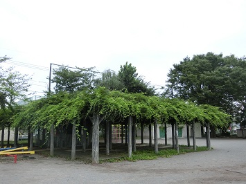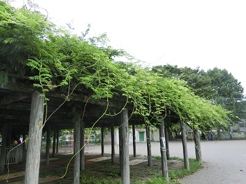 前回の剪定から数ヶ月経ち,大藤のツルが地面に届きそうなくらい伸びていました。そのツルにも緑の葉が生い茂り,いつもより以上に迫力があります。