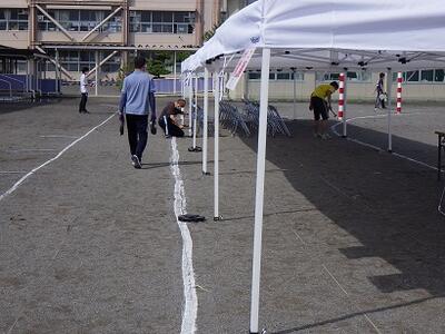 PTA執行部の方々を中心に運動会当日の朝早くから準備をし,保護者の方が利用する駐輪場の整備や,誘導などをしてくださいました。また,運動会が無事に終わり,片付けをしている最中にも,有志の方々がテントの片付けと運搬を手伝ってくださいました。