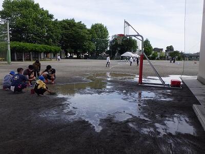 運動会の前日は昼過ぎまで大雨。雨が上がるとすぐに運動会の準備をしました。6年生も机を運んだり,校庭に落ちている石を拾ったりとたくさん働いていました。特に大変だったのが,南校舎横にできてしまった水たまり。当日は通路としてたくさんの人が通るため,ちりとりやバケツを使って水をすくい外へ流しました。