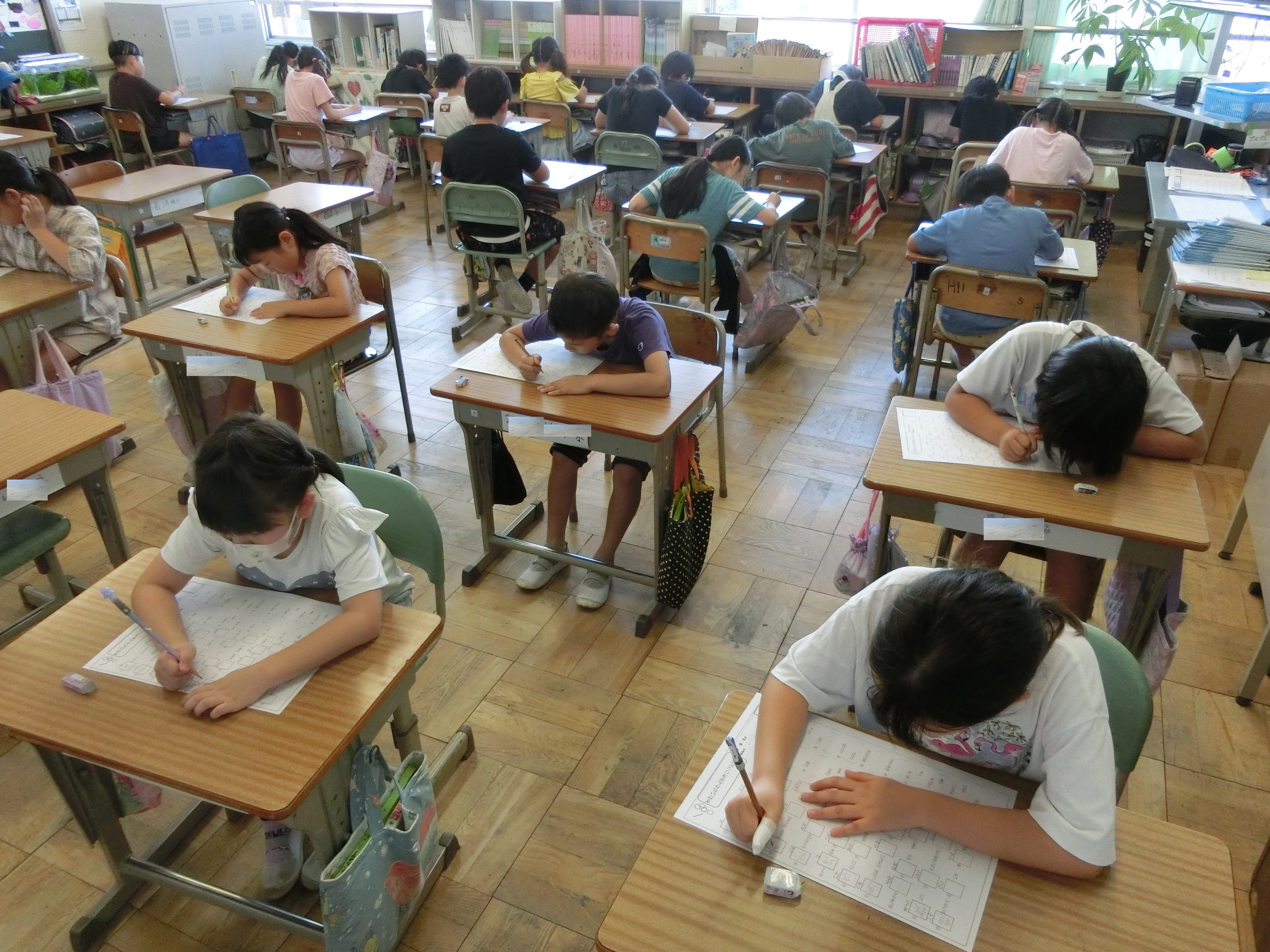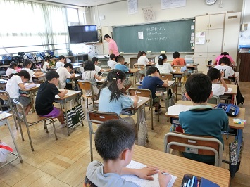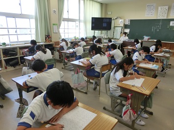 8時5分になると校内に開会式の音楽が流れました。オリンピック開始の合図と同時に一斉にスタート。前学年で習った漢字の中から50題,読みと書きの問題が出されました。