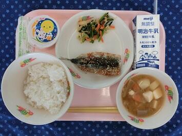 <献立>麦入りご飯,牛乳,いわしのかばやき,ごまあえ,みそけんちん汁,十五夜デザート