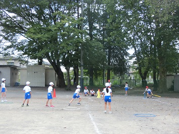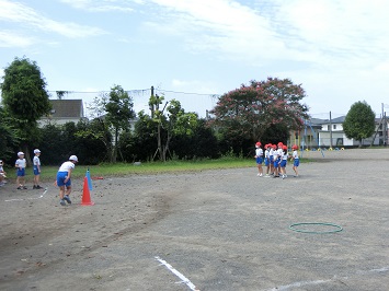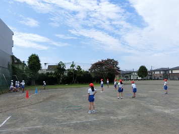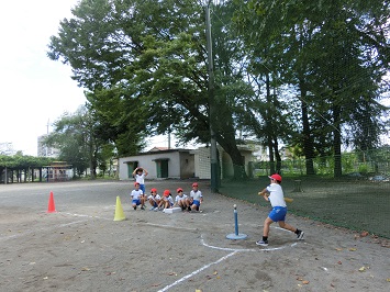赤と白の2チーム分かれ,攻守を交代しながら行いました。攻めのチームは,ティーの上に置いたボールをよく見て打ち,守りのチームは,打たれたボールを追いかけ上手にキャッチしていました。