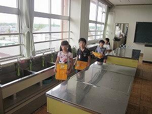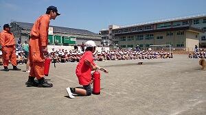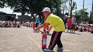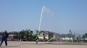 避難の後は,水消火器による消火訓練を行ったり,消防車の放水の様子を見せていただいたりしました。