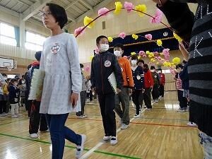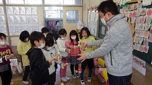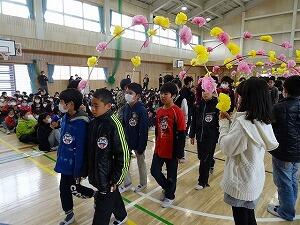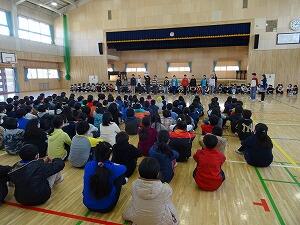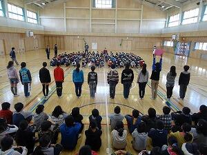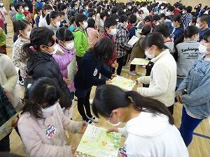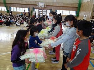 体育館に全校児童が集まり,縦割り班ごとに6年生へのメッセージが書かれた色紙をプレゼントしました。6年生からは,感謝の気持ちとして,手作りの雑巾をプレゼントしました。