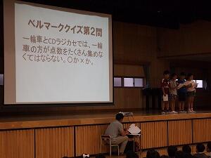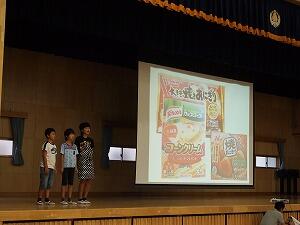 劇やクイズを交えながら,身近なものにベルマークがあること,ベルマークを利用すると様々なものが購入できることを全校に向けて発表していました。